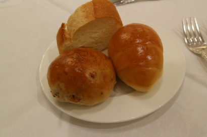 【パン】左手でちぎって右手に持ちかえて食べます。