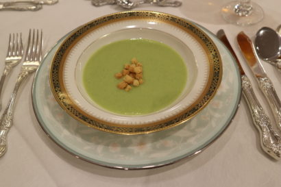 【グリーンピースのポタージュ】スープスプーンを鉛筆を持つようにして持ち、手前からすくって飲みます。