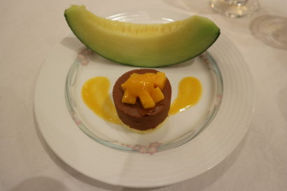 【チョコレートムース マンゴーソース】デザートには季節のフルーツが!メロンはナイフとフォークを使って食べます。切れ込みは入っていないので、自分で綺麗にカットします。