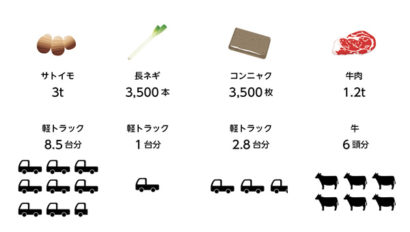 直径6.5mの大鍋に、里芋3トン、こんにゃく3500枚、ねぎ3500本、牛肉1.2トン、味付けに醤油700L・・・と桁違いの具が入り提供されます。