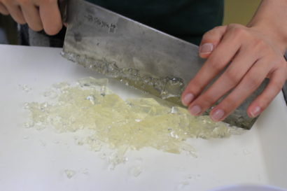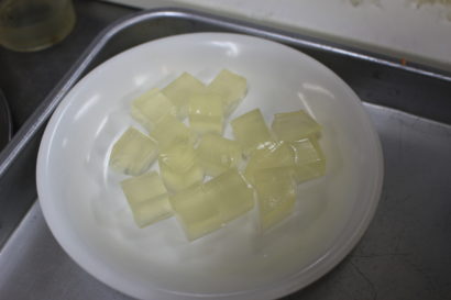 鶏ガラスープにゼラチンをいれて固めたゼリーを切ってます。