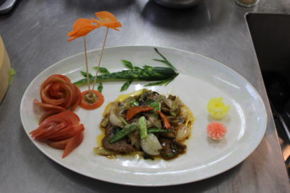 野菜の彫刻(人参で蝶、小玉葱で蓮の花)