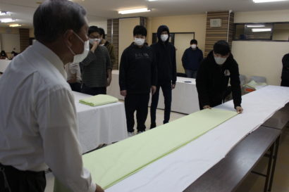 まずは先生と一緒にクロスを敷いていきます。
