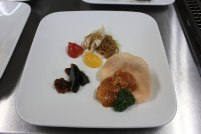 バンバンジー、クラゲ、ピータンジュレソース添え、海老せんべい、エビチリ、プチトマト赤、黄