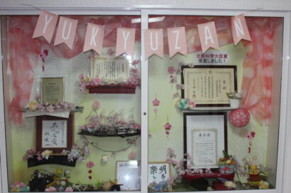 学校の玄関にあるショーウィンドウのレイアウトを変えるのも学生会のお仕事です。