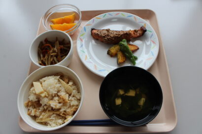 春らしくたけのこご飯とゴマが香ばしい鮭の利久焼き
