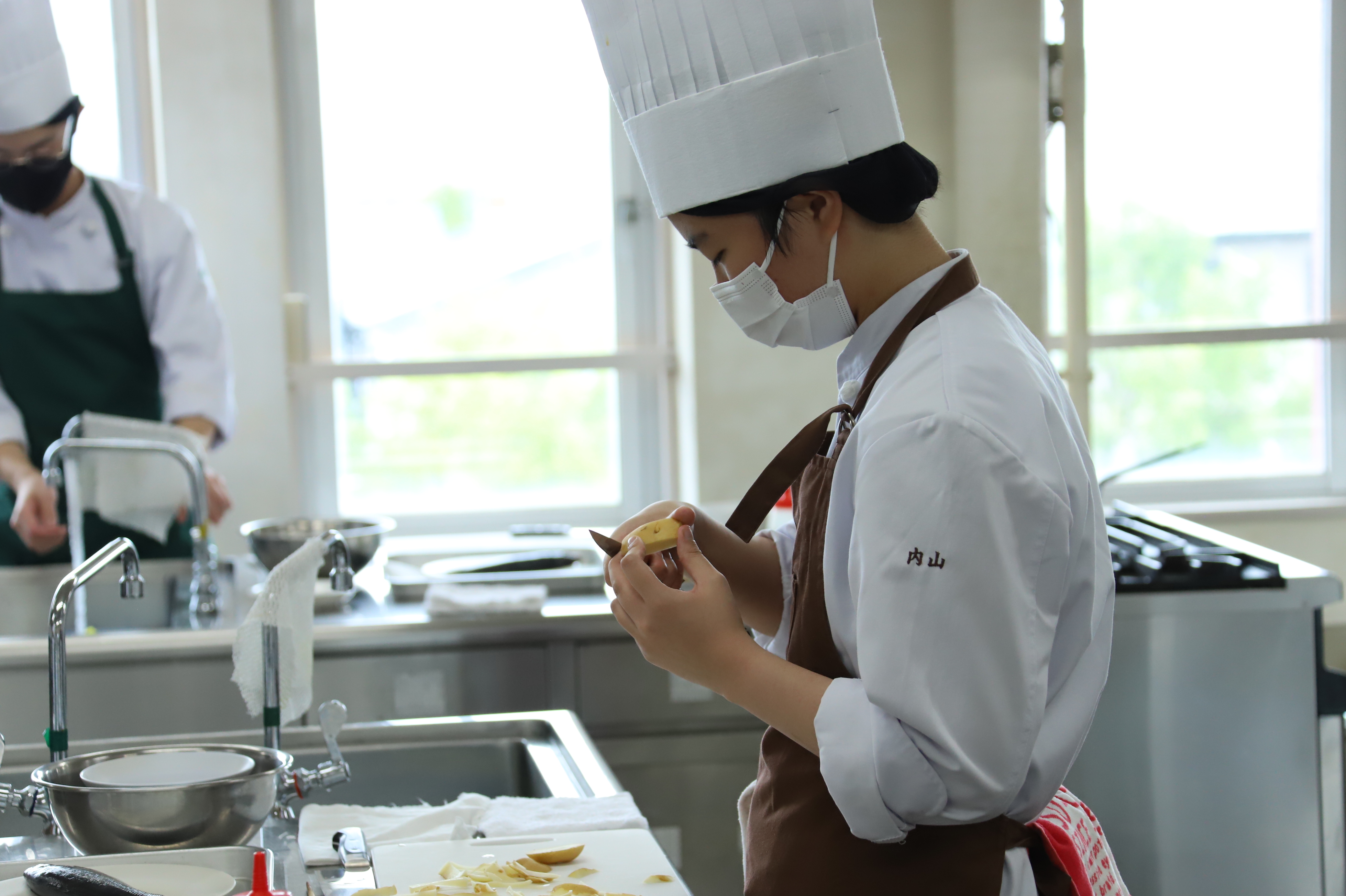 ペティナイフでジャガイモのシャトーを剝いています。