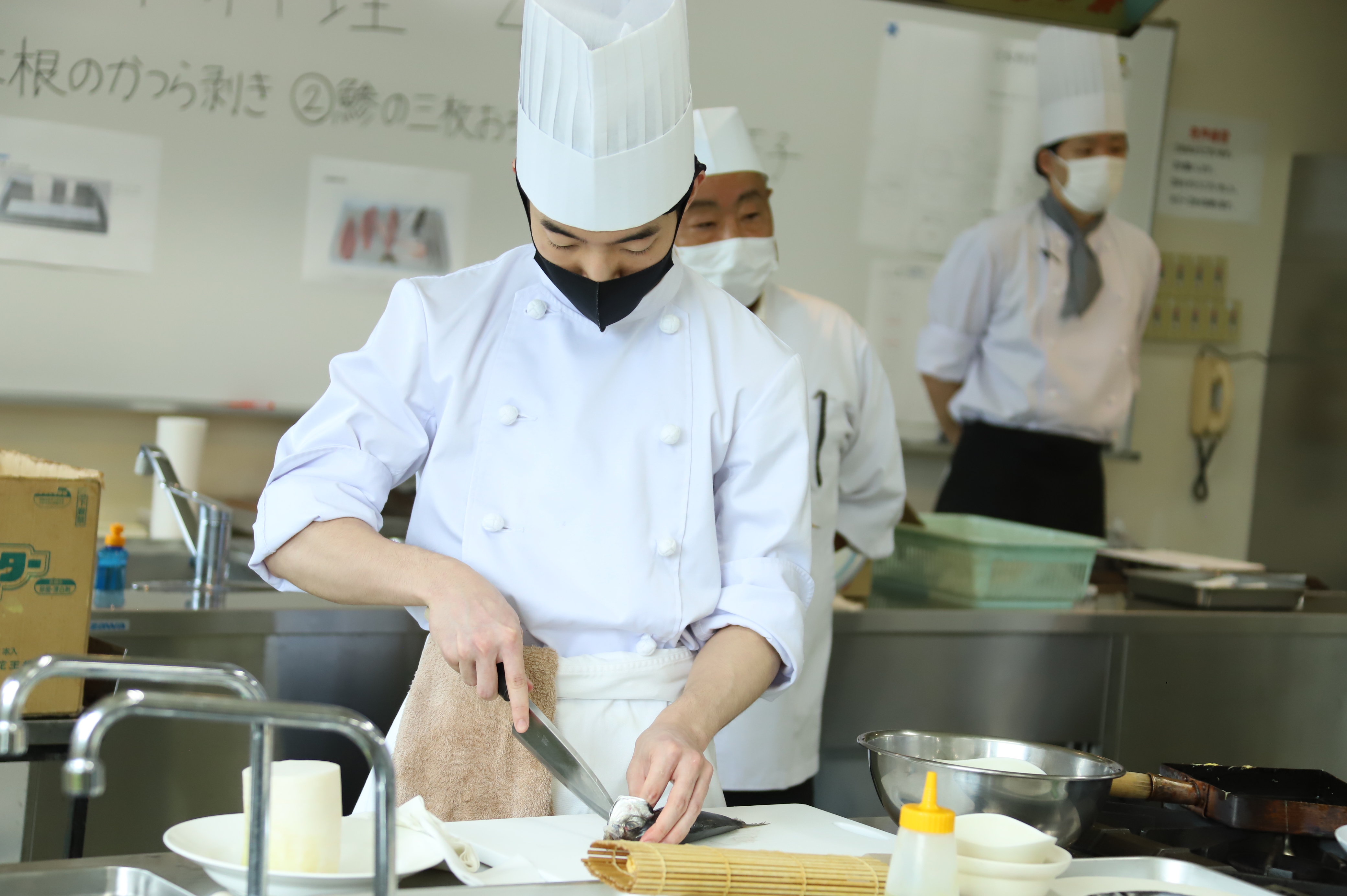 日本料理部門の鯵の三枚おろしをしています。