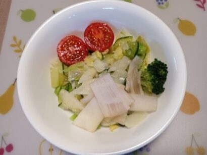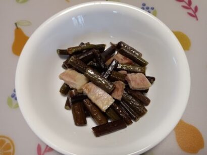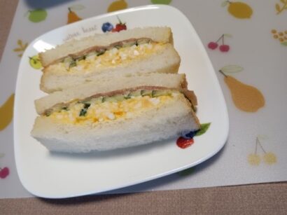 おうち食パンのサンドイッチ 塩立てサラダ ワラビの塩炒め