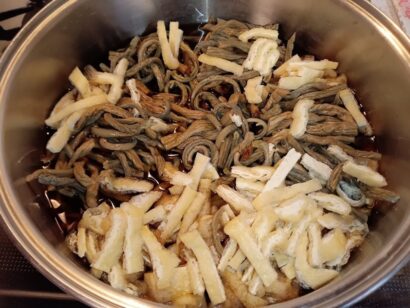 「煮なます」を教えてもらった。これが、関西の煮なますとは全然ちがって、ちょっとナムル風 ポイントは材料を全部包丁で手切り