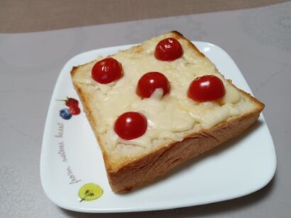 おうちの食パン(好きな厚さ) にピザチーズのせて ミニトマトのせて 中温で焼くだけ