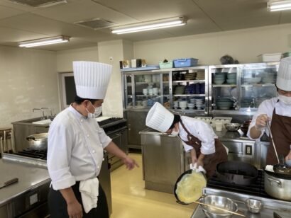 薄焼き玉子の焼き方の指導をしています。