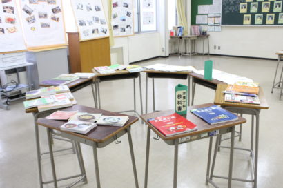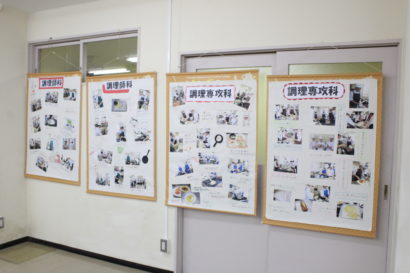 控室では、学校生活の様子を写真で紹介したり、普段使っている教科書や包丁などの教材について学生が説明をしました。