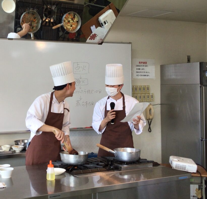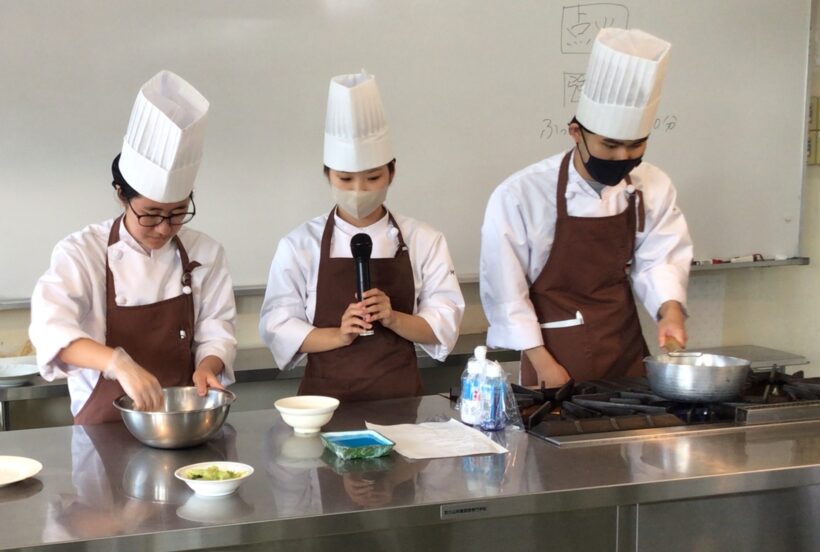 普段は自分たちが教わる側の調理実習を、今回は「教える側」となり小学生にわかりやすく伝えるために、何度も繰り返し練習します。