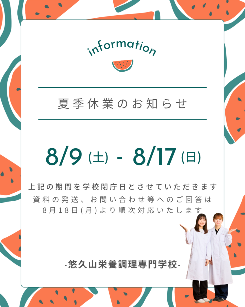 悠久山栄養調理専門学校では、下記の期間を夏季休業といたします。