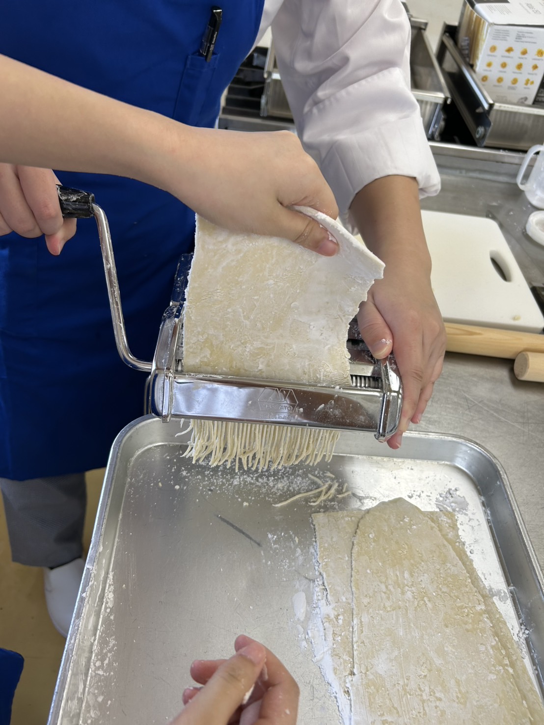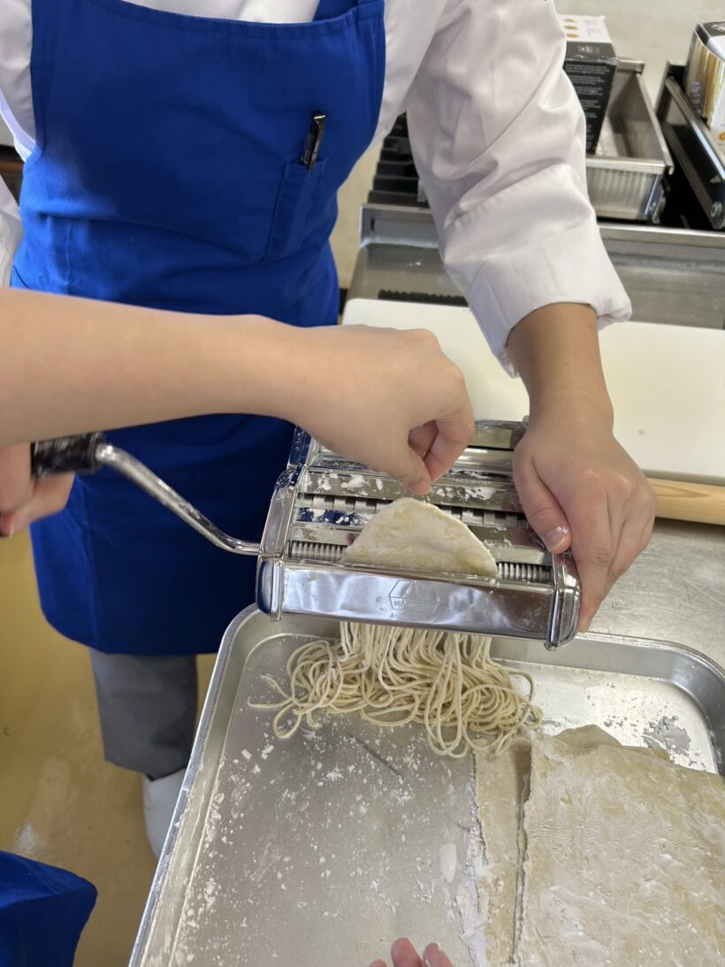 今回は、小麦粉にかん水を入れて練り生地にしてパスタマシーンで