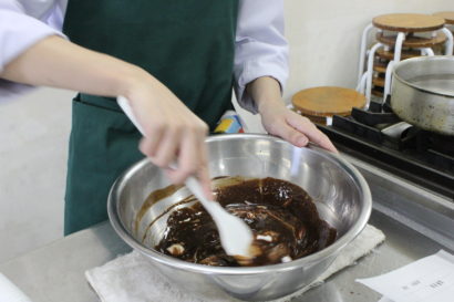 これは、調理師科が製菓実習でガトーショコラを作っている様子です。